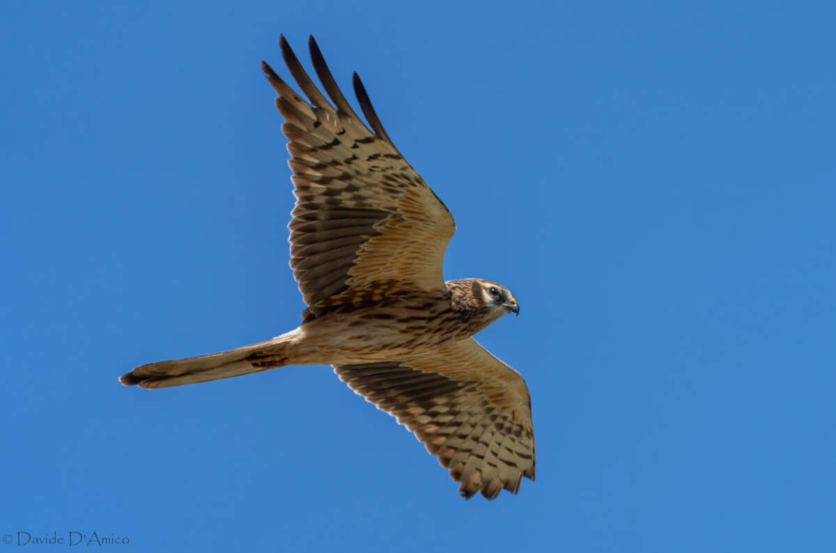 Certamente non come sullo Stretto di Messina, ma le osservazioni primaverili e, in minor misura autunnale, sulle piccole isole italiane (es. Pantelleria, Ustica, Isole Eolie) riservano anche emozionanti giornate di passaggio di rapaci – qui sotto un juv. al 2CY (2° anno-calendario) di Albanella minore (Circus pygargus) fotografato da Davide D’Amico.